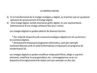 LA IMATGE DIGITALEsla transformació de la imatge analógica a digital, es el primer pas en qualsevolaplicació de processamentd’imatge digital. Una imatge digital, també anomenatgràfic digital, és una representació bidimensional d'unaimatgeutilitzant bits (uns i zeros)