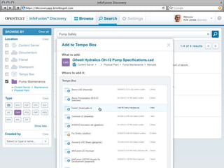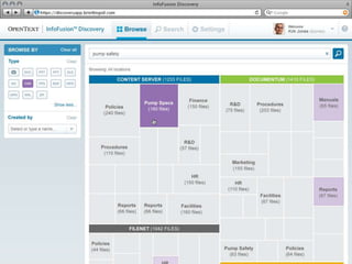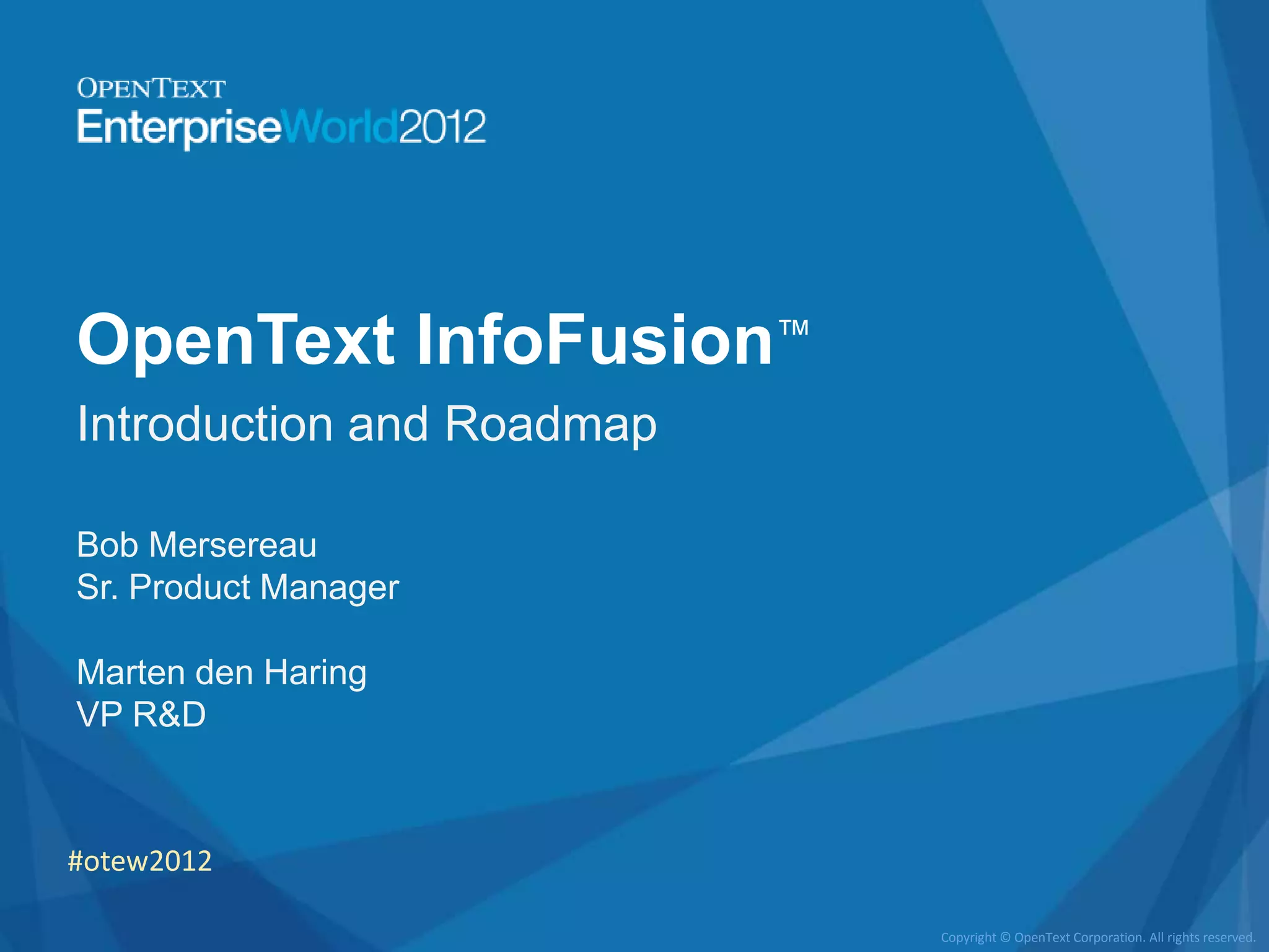 InfoFusion is an information access platform from OpenText that allows users to discover, analyze, and act on information from across an organization. It connects to different data sources, extracts metadata, and provides a unified search index. The roadmap outlines expanding connectors, search and analytics capabilities, and embeddable user interface components over the next three years. It aims to address issues like information silos, complex IT environments, and the need to access both structured and unstructured data.