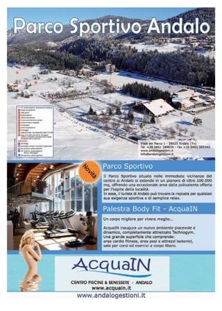 Il documento fornisce un elenco dettagliato di contatti e servizi disponibili per l'inverno 2011/2012 nelle località di Andalo, Molveno, Fai della Paganella, Cavedago e Spormaggiore. Include informazioni su aziende locali, emergenze sanitarie, servizi turistici, e una vasta gamma di attività ricreative. È un gui di utilità per residenti e visitatori per accedere a informazioni essenziali sulla zona.