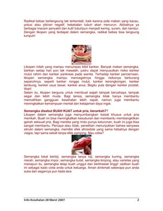 Semangka dipercaya berasal dari Afrika dan pertama kali dipanen 5000 tahun lalu di Mesir. Semangka mengandung likopen yang berfungsi sebagai antioksidan dan dapat mencegah kanker. Semangka juga kaya akan air dan kaliumnya yang baik untuk menurunkan tekanan darah.