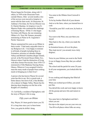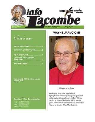 The document provides details about three Oblate priests - Wayne Jarvo, Jean-Paul Vantroys, and John Brieux. It summarizes Wayne Jarvo's 50 years as an Oblate brother, working in various missions and homes. It describes Jean-Paul Vantroys' 60 years as a priest in northern Alberta missions among Cree and other Indigenous communities. It outlines John Brieux's time ministering in various parishes in British Columbia, including helping communities overcome alcoholism and establish Indigenous leadership.