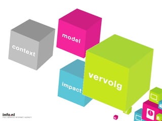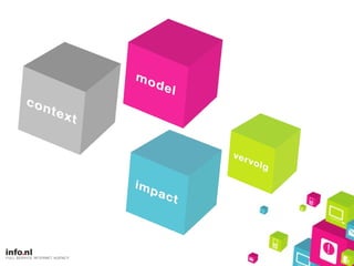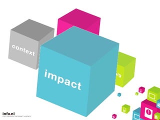 Gedrag verandert 90,1% internetgebruik in NL hoogste in Europa 2008 besteed 2x meer tijd online dan 2006 80 minuten per dag in alle leeftijden in 2011 > 50% gebruikt mobiel internet 2008 is 10% 49% is lid van 1 of meer sociale netwerken internationaal het hoogste percentage