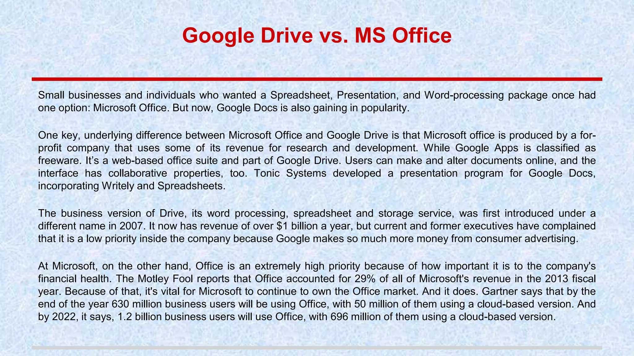 Google Drive is a free web-based office suite and file storage service that provides alternatives to Microsoft Office applications like Word, PowerPoint, and Excel through online applications called Google Docs, Slides, and Sheets respectively. While Microsoft Office is produced by a for-profit company, Google Drive applications are classified as freeware. Key differences between the services include that Office accounts for a large portion of Microsoft's revenue, making it a high priority, whereas Google Drive currently generates over $1 billion in revenue per year but is considered a lower priority. Google Drive allows for real-time collaboration and includes additional applications like Forms and Drawings.