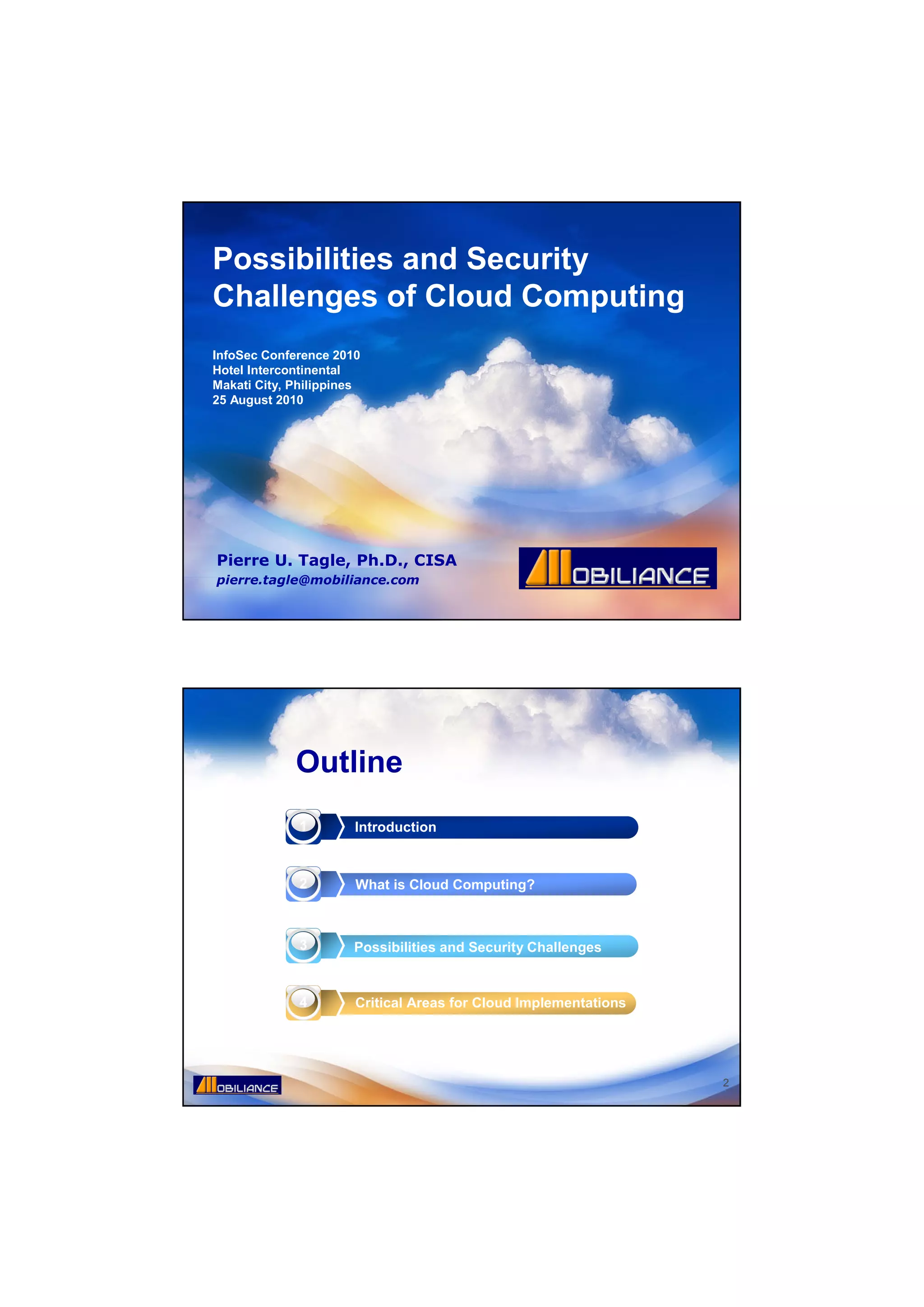 The document discusses the possibilities and security challenges of cloud computing, emphasizing its role as a business evolution rather than a technology revolution. It outlines various cloud service models, deployment models, and critical governance domains, while also addressing major concerns such as data protection, compliance, and incident management. Ultimately, it stresses the importance of understanding both operational and security implications when considering cloud adoption.