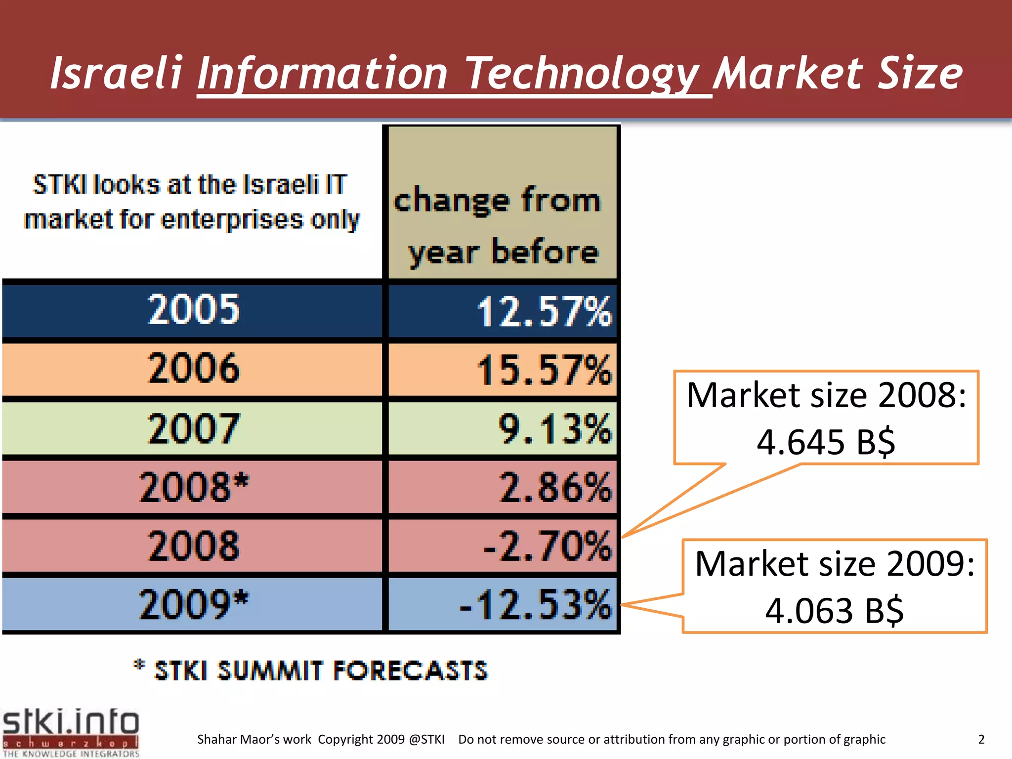 This document summarizes the Israeli information technology and security markets. It provides statistics on the market size of the Israeli IT market in 2008 and 2009. It also discusses topics such as the concerns of Israeli CISOs, local security vendors, network access control, data security, identity and access management, and governance, risk, and compliance. Key local security vendors and their positioning in various markets are mentioned. The conclusion encourages the reader to review analyst reports and consider alternative local solutions.