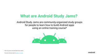 Android Study Jams are community-organized study groups where people can learn to build Android apps using online training courses. There are two tracks for learners - one for those new to programming, and one for those with prior programming experience.