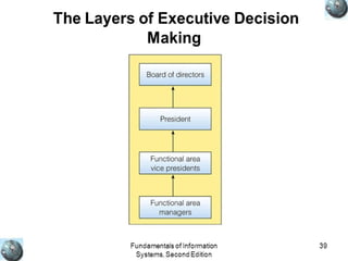 Functional information systems provide detailed operational information and summarized management information. There are several types including finance, accounting, marketing, operations, and human resources systems. Decision support systems and executive information systems support non-routine decision making. Key characteristics of these systems include flexibility, interactivity, and ease of use. Geographic information systems capture and manage spatial and location-based data to support analysis and decision making. International information systems support global operations through transnational, global, or collaborative architectures tailored to an organization's business strategy.