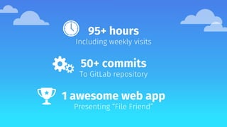 Kayla Barrera completed a 95+ hour shadowing project with mentor River Ross to create a secure file transfer web application called "File Friend". The app allows users to invite others, send files peer-to-peer without third party storage, and ensures files are not vulnerable to breaches. Kayla learned technical skills like JavaScript, frameworks, and version control through independently developing the app, which was deployed using technologies like WebRTC, Vue.js, Bulma, and AWS services. She also gained valuable lessons around time management, the software development process, and the benefits of passion-driven independent projects and mentorship.