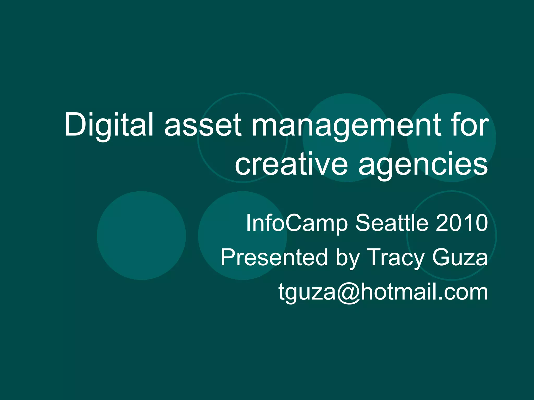 The document discusses digital asset management (DAM) for creative agencies, focusing on considerations for organizing files, selecting a DAM platform, and future growth. Key topics include file types, user access, budgeting, metadata preparation, and project management. It emphasizes the importance of consistency, file naming conventions, and the evaluation of controlled vocabulary for improved organization and findability.