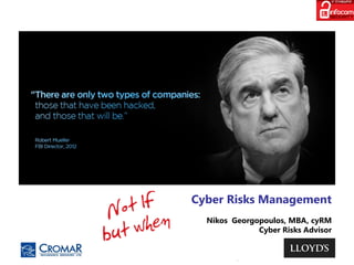 This document provides an overview of cyber risks management and cyber insurance. It discusses key topics like the costs of data breaches, regulations like GDPR, prevention strategies, how insurers evaluate cyber risk, and available insurance covers. Appendices provide more details on the historical development of cyber insurance and common types of first-party and third-party insurance covers. Resources are also listed for getting cyber insurance quotes in Greece and learning more about privacy and cybersecurity risk advising.