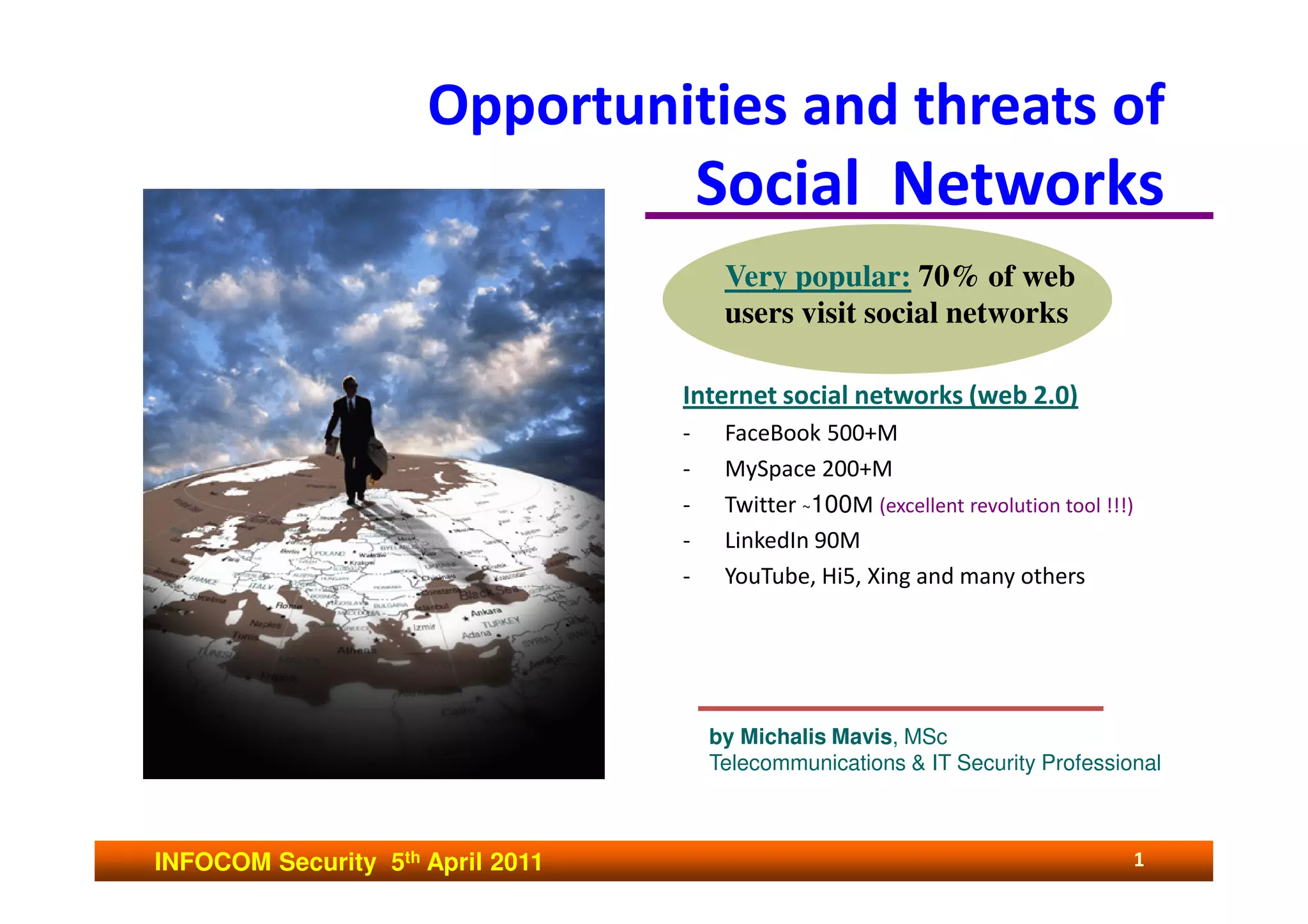 The document discusses opportunities and threats related to social networks. It notes that 70% of web users visit social networks, with major platforms like Facebook, MySpace, Twitter, and LinkedIn having hundreds of millions of users each. However, it also outlines privacy and security risks like identity theft, malware propagation, and corporate data leakage that social networks can enable if not used carefully. The document provides an overview of these risks and threats as well as recommendations for safe social network usage.