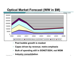 The document summarizes the future of optical networking. It predicts modest post-bubble growth driven by revenue, with most spending still on SONET/SDH rather than WDM. It outlines the adoption of multi-service provisioning platforms, multi-service switching platforms, and multi-service transport platforms over time. Finally, it describes how MSPPs, MSSPs, and MSTPs fit into access/collector, intra-metro/regional, and inter-office networks.