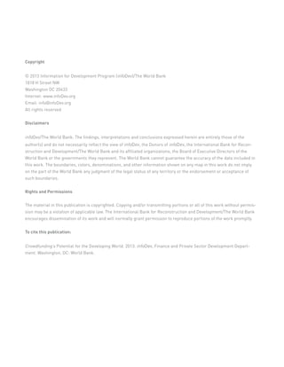 The document discusses the potential of crowdfunding as an innovative financial solution for entrepreneurs in the developing world, highlighting its ability to raise capital via social networks. It emphasizes that with technology advancements and a supportive regulatory environment, developing nations could leverage crowdfunding to stimulate economic growth and foster entrepreneurial ecosystems. Key recommendations include creating a conducive policy framework, utilizing technology for trust-building, and addressing existing regulatory barriers to promote successful crowdfunding initiatives.