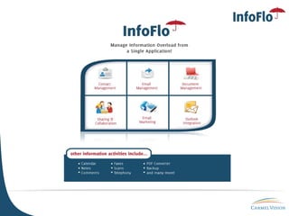 InfoFlo offers an integrated CRM, contact management, and office management solution with a central database at an affordable price. Their unique selling proposition includes a feature-rich core package with optional addons, an easy to use interface, custom scanning workflows, and affordable pricing with free upgrades for life. They currently have over 1000 customers across several countries.