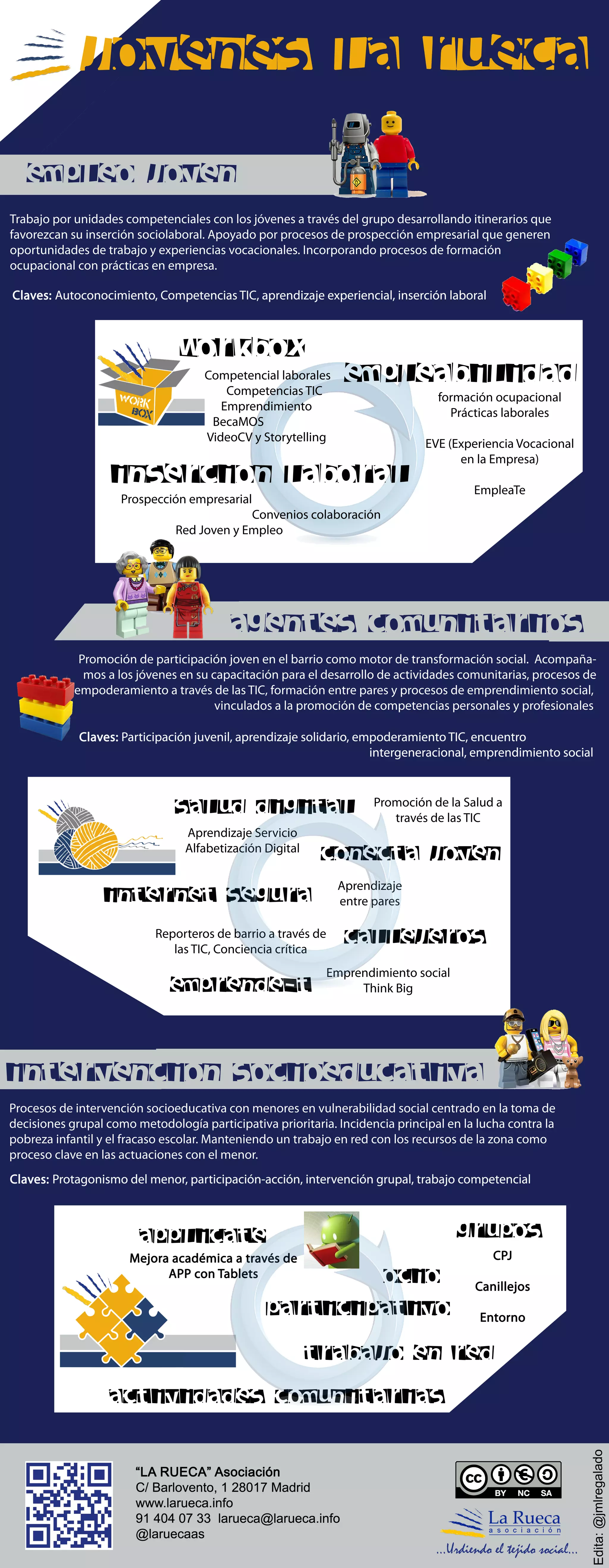 Infografía que resume cual es la estrategía y acciones con jóvenes en LA RUECA Asociación.