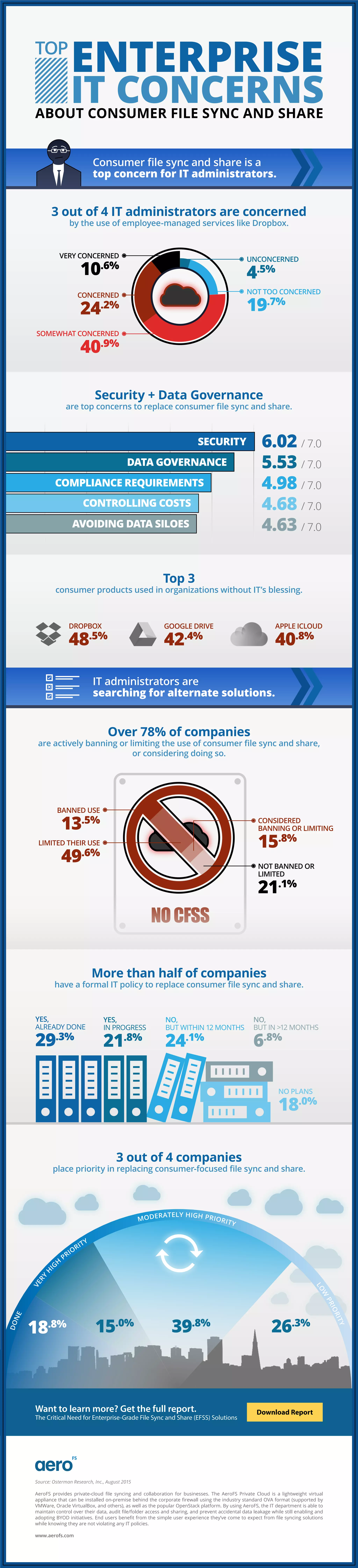 Aerofs offers a private-cloud solution for file syncing and collaboration, allowing businesses to maintain data control and prevent leakage while supporting BYOD initiatives. IT administrators express significant concern over employee-managed services, with a majority actively seeking to replace consumer file sharing solutions like Dropbox and Google Drive due to security and governance issues. Over 78% of companies are either banning or limiting the use of these consumer services within their organizations.