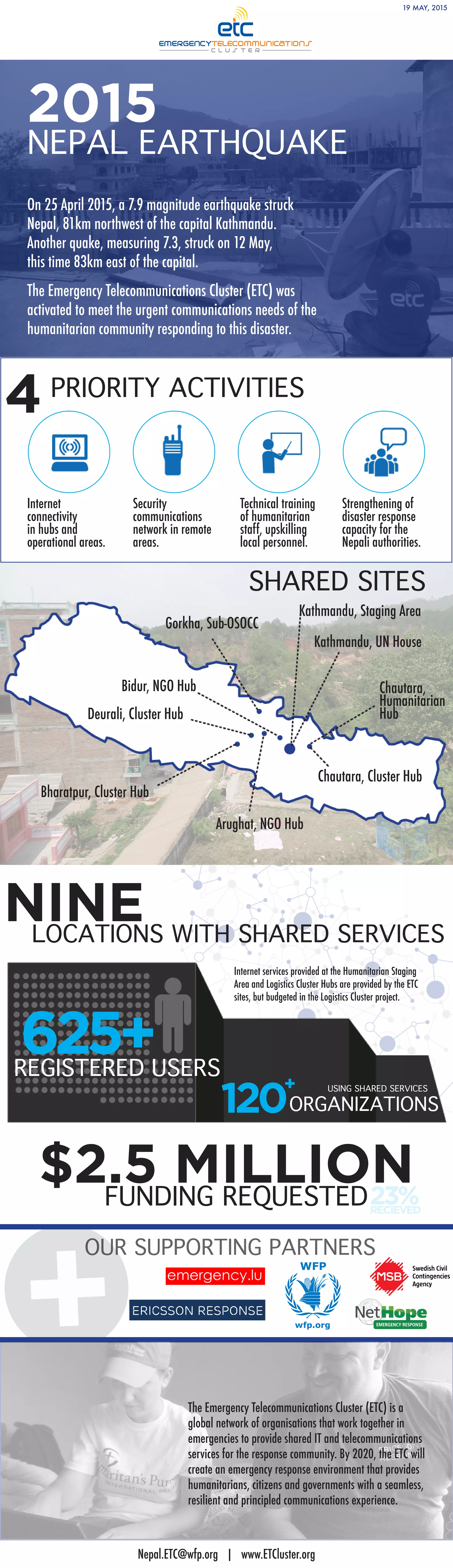 The Emergency Telecommunications Cluster (ETC) was activated to provide communications support for humanitarian organizations responding to earthquakes in Nepal in April and May 2015. The ETC requested $2.5 million to provide internet connectivity at nine locations, establish a security communications network in remote areas, conduct technical training, and strengthen Nepal's disaster response capacity. As of May 19th, the ETC had registered over 625 users from 120 organizations using its shared services across 19 sites.