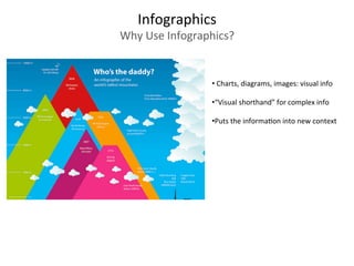 The document discusses infographics, which are visual representations of information or data. It explains that infographics use charts, diagrams and images to convey complex information visually. There are three main parts to an infographic: the visual elements, the content or data, and conclusions. The document provides tips for designing effective infographics, such as being concise, visual, transparent and creative. It also lists some online tools that can be used to create infographics and provides examples of well-designed infographics.