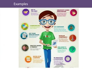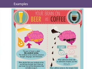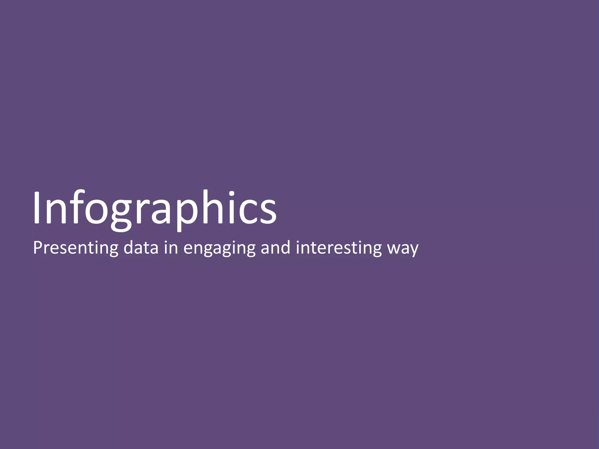This document discusses infographics and how they can be an effective way to present data visually. It begins by defining infographics and explaining why they are effective by leveraging how the human brain processes visual information better than text. The document then discusses key aspects of infographics like visual content, data/content, and conveying a message or insight. It provides examples of effective and ineffective infographics. Finally, it discusses tools that can be used to create infographics, including desktop software like Adobe Illustrator and online tools like Visual.ly and Wordle.net that allow creating different types of visualizations.