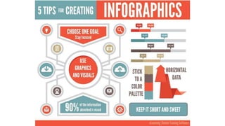 Infographics are visual representations of information, data, or knowledge that combine graphics, icons, and text to convey complex information quickly and clearly. They can be used in education to explain processes, make comparisons, analyze data, and create timelines. Infographics contain textual elements like titles, headings, words, and numbers alongside visual elements such as color, images, charts, and timelines. Teachers have many free online resources available to help them create their own infographics, including Piktochart, Infogram, Easelly, and Google Drawings, or they can find pre-made infographics on sites like the Infographic Archive and Information is Beautiful.