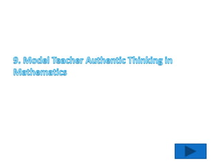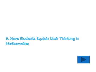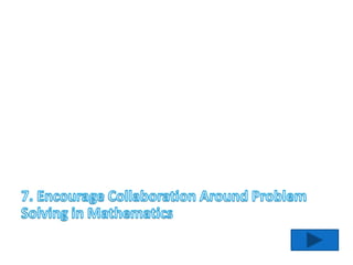 This document provides a summary of 10 strategies for strengthening mathematics in the classroom presented by Janice Vaughn. The strategies are: 1) Create a mathematics environment in the classroom; 2) Plan to connect with parents about mathematics; 3) Research mathematics websites for students; 4) Supply mathematics manipulatives; 5) Have students explain their thinking in mathematics; 6) Seek opportunities for professional growth in mathematics; 7) Encourage collaboration around problem solving in mathematics; 8) Integrate mathematics across other subjects; 9) Model teacher authentic thinking in mathematics; 10) Share successes in mathematics. The document then provides more details and examples for each of the 10 strategies.