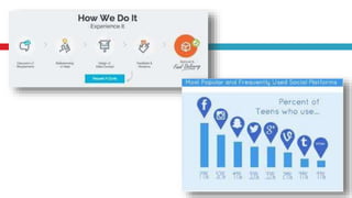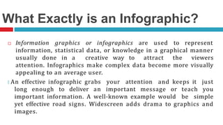 The document discusses infographics and how to create effective ones. It defines infographics as using visuals like graphics and icons to represent information in an engaging way. Effective infographics grab attention, deliver an important message simply, and encourage sharing. When creating infographics, designers should make them unique yet simple, creative but bold, and use minimal text to emphasize the key message. This encourages audiences to engage with and spread the infographic. Common chart types for infographics include pie charts, bar graphs and line charts. Overall, well-designed infographics can boost a brand's awareness, make content viral, and position the creator as an expert.