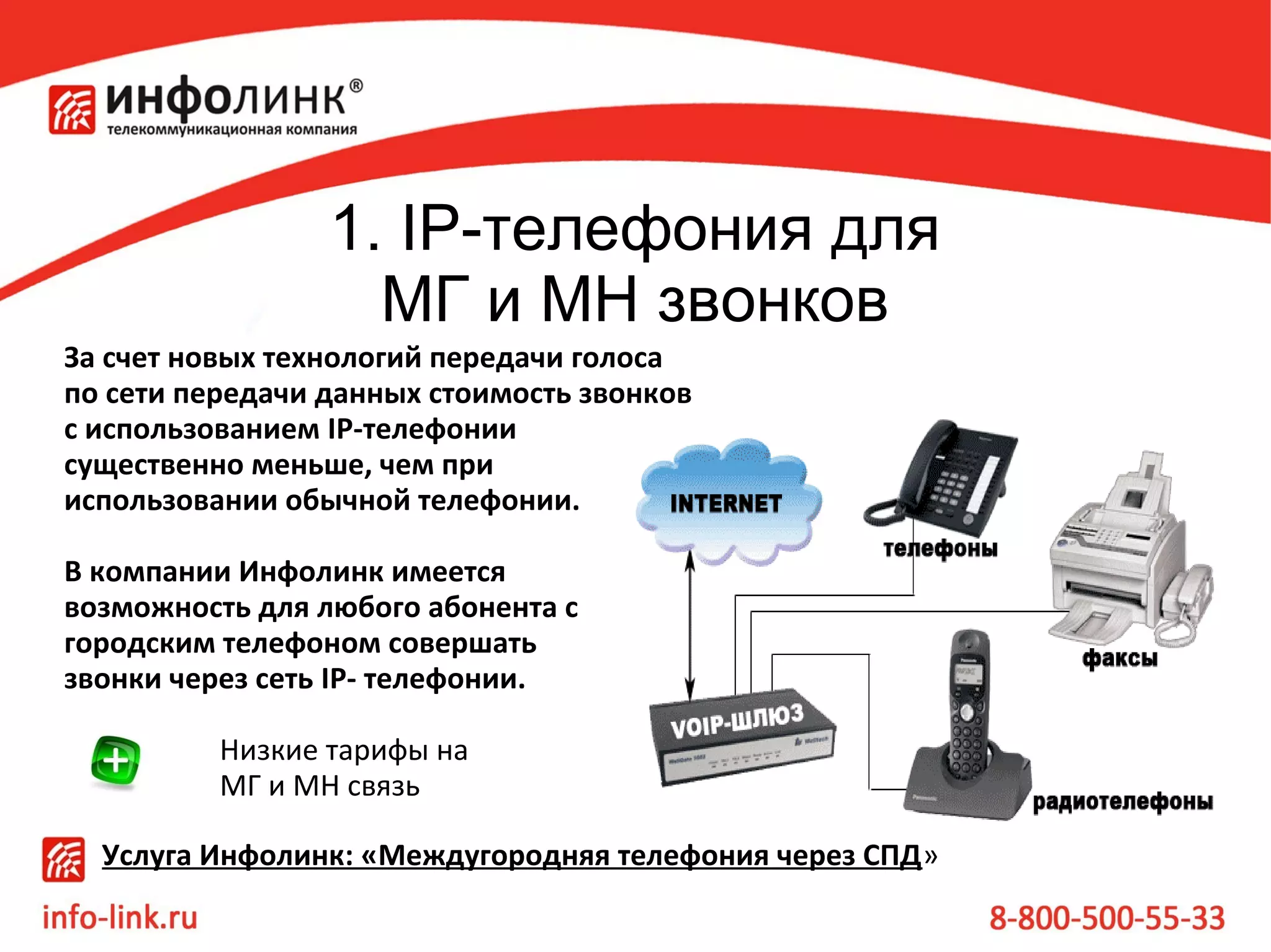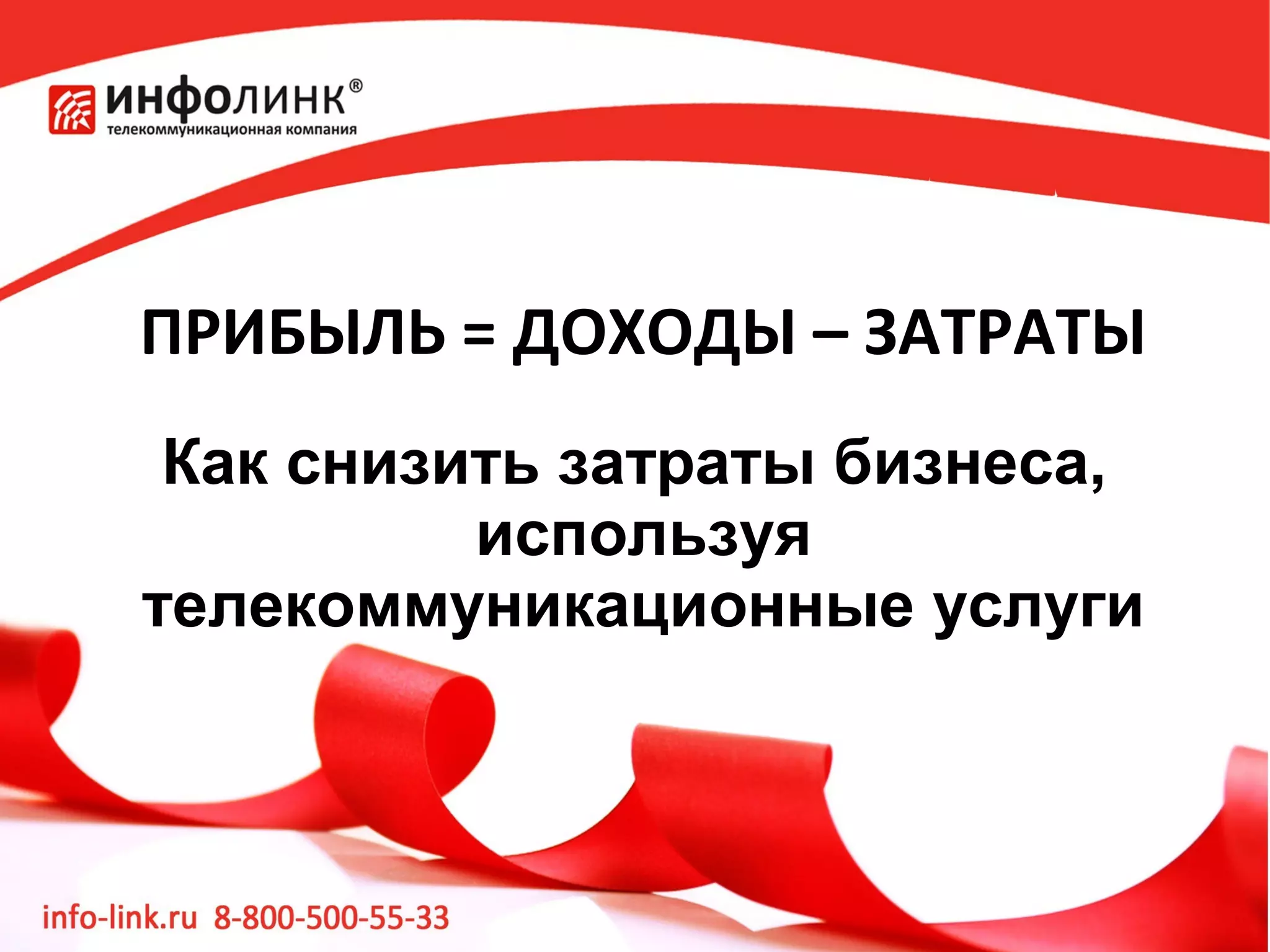 Документ описывает способы снижения затрат бизнеса с помощью телекоммуникационных услуг компании Инфолинк. Основные предложения включают IP-телефонию, виртуальные АТС, корпоративные сети и облачные сервисы, которые обеспечивают низкие тарифы, отсутствие первоначальных затрат и упрощение бизнес-процессов. Также рассматриваются услуги видеонаблюдения и корпоративного Wi-Fi для дальнейшей оптимизации расходов на связь.