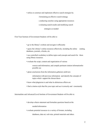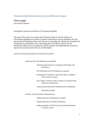 The document provides an outline for teaching information literacy skills to students in the Tennessee State University Institute of Government. It covers how to define a research topic, gather background information from various sources, search databases and the online catalog for relevant materials, evaluate internet resources, and write a research paper while properly citing sources. The goal is to ensure students are literate in determining what information they need, accessing and critically evaluating information from different sources, and using it effectively for specific purposes while understanding legal and ethical issues related to information use.
