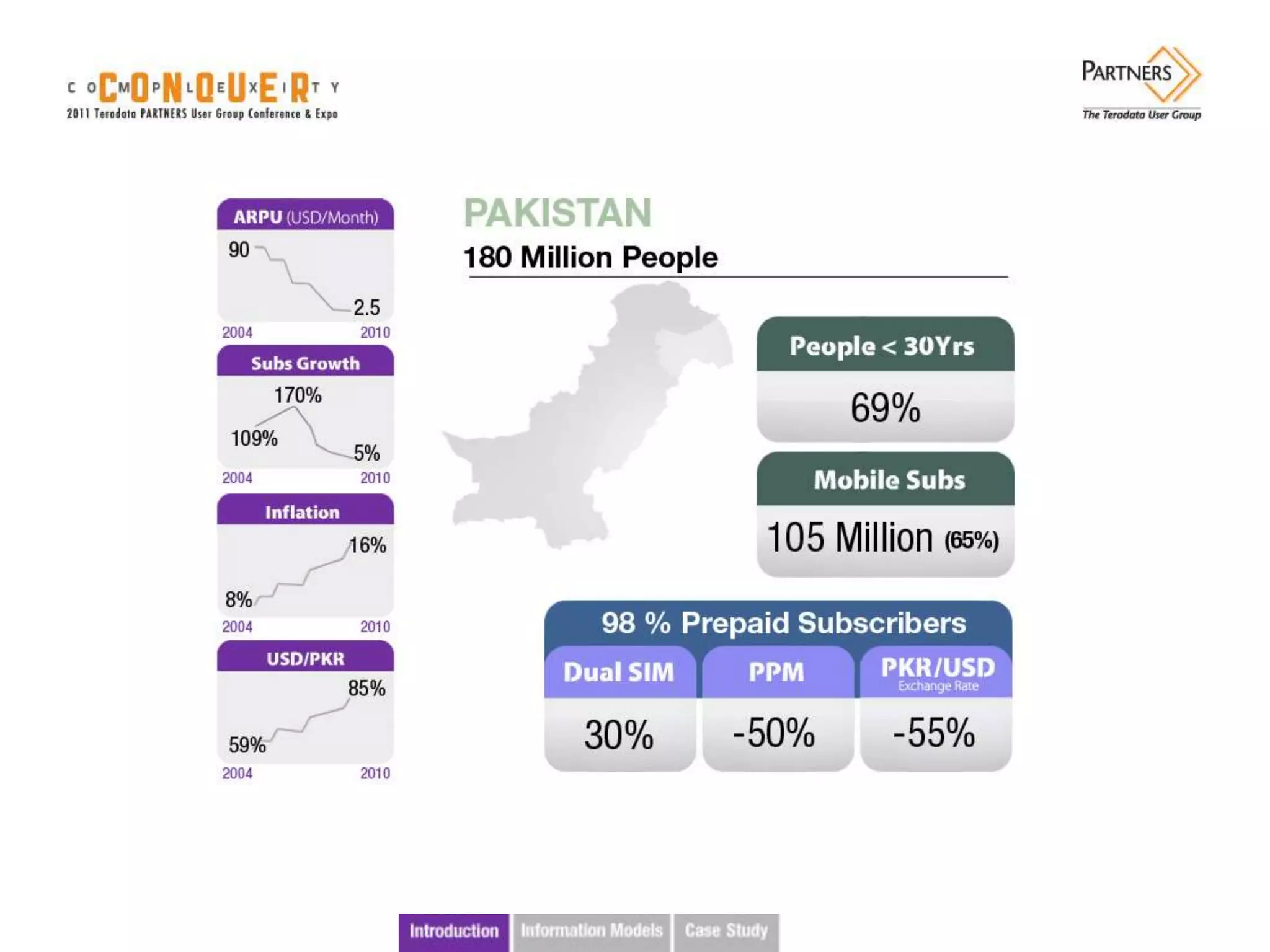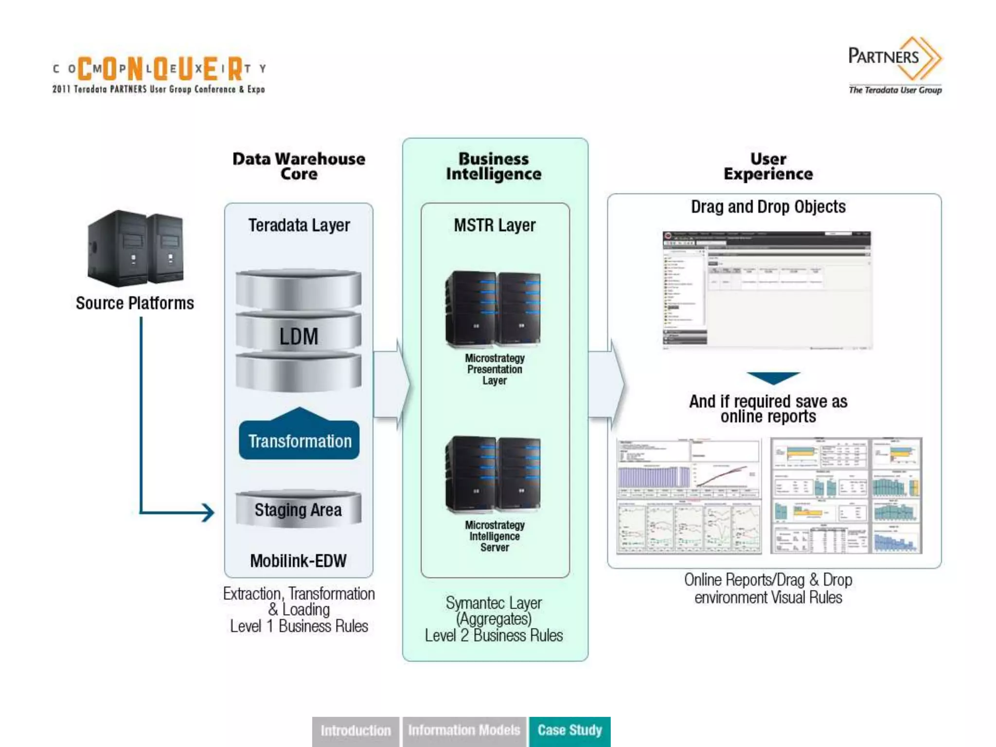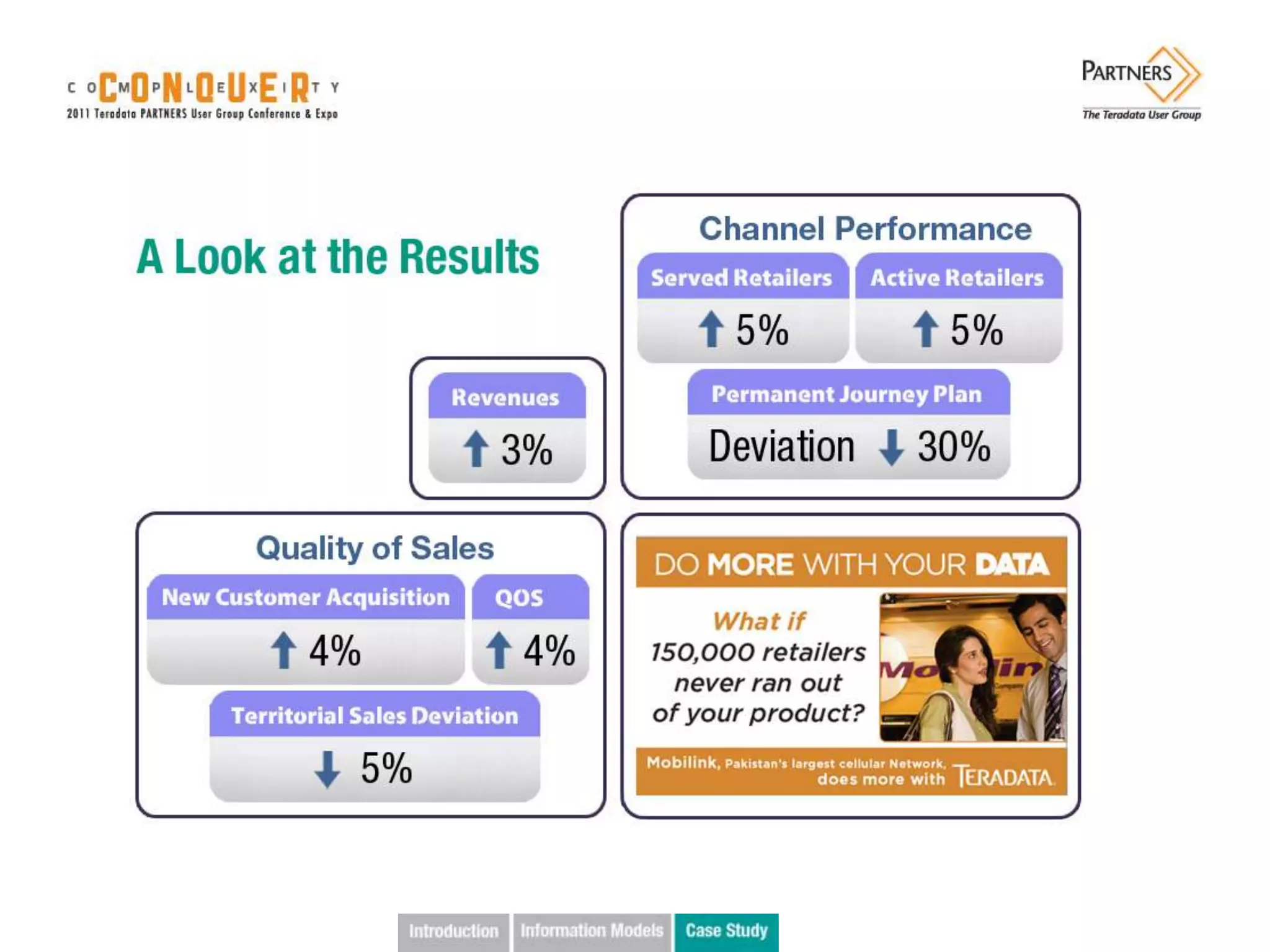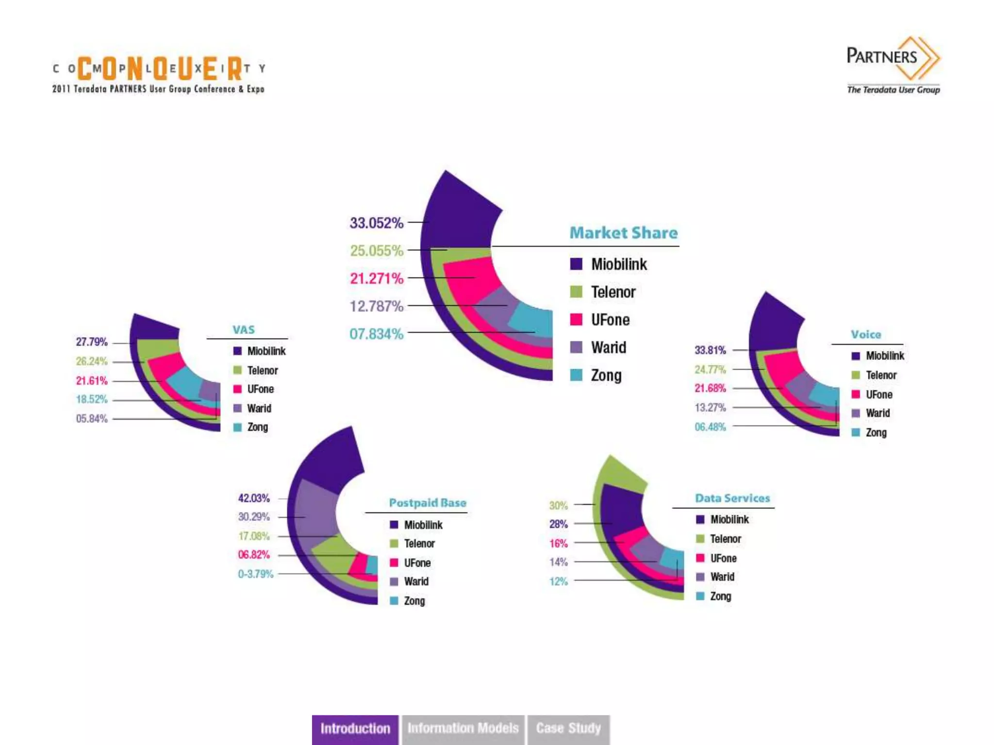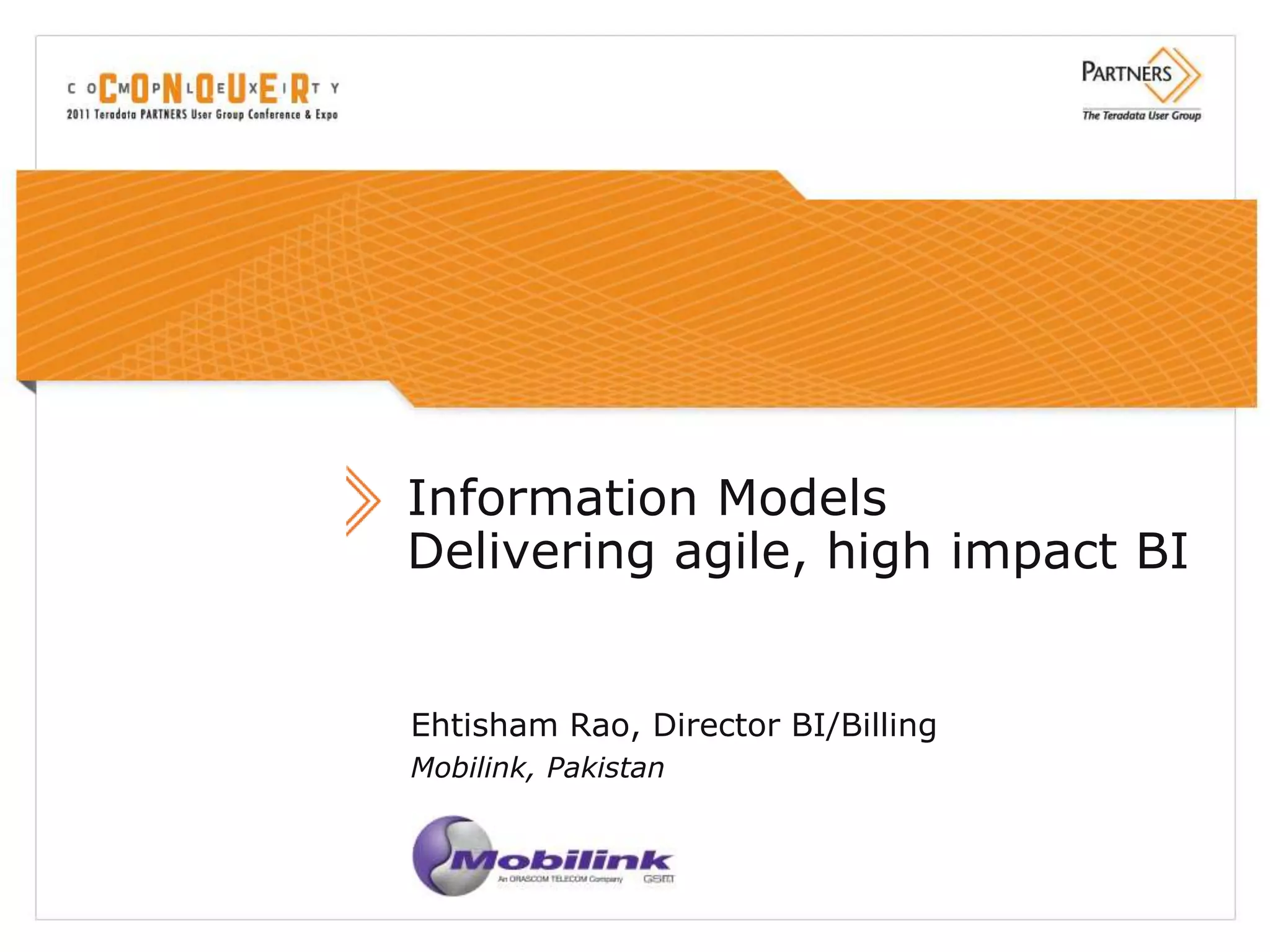 The document discusses proposed information models and architectures for delivering agile and impactful business intelligence at Mobilink Pakistan. It describes a top-down user-centered approach to building contextual and predictive information models based on user requirements. Key elements include a presentation layer for visualization, a semantic data layer to correlate data to business objects, and a data warehouse infrastructure. Specific information models are proposed for sales, IN swap and VAS products, postpaid customers, and more to provide the right information from various data sources. The goal is to transform the customer experience through better insights.