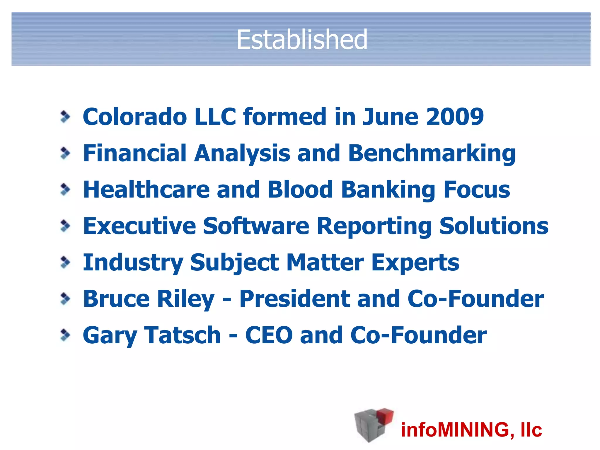 InfoMINING is a Colorado LLC established in 2009 that focuses on providing financial analysis, benchmarking, and executive software reporting solutions for healthcare and blood banking companies. It uses data analytics to provide business insights and key performance indicators (KPIs) to help executives make faster, more precise decisions. InfoMINING offers services such as financial gap analysis, balanced scorecard consulting, and executive dashboard software to measure KPIs and monitor systems and processes. Its donorMINING software is tailored for the blood banking industry.