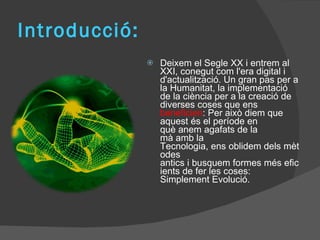 Introducció: Deixemel Segle XX i entrem al XXI, conegut com l'era digital i d'actualització. Un gran pas per a la Humanitat, la implementació de la ciència per a la creació de diverses coses que ens beneficien : Per això diem que aquest és el període en què anem agafats de la mà amb la Tecnologia, ens oblidem dels mètodes antics i busquem formes més eficients de fer les coses: Simplement Evolució.