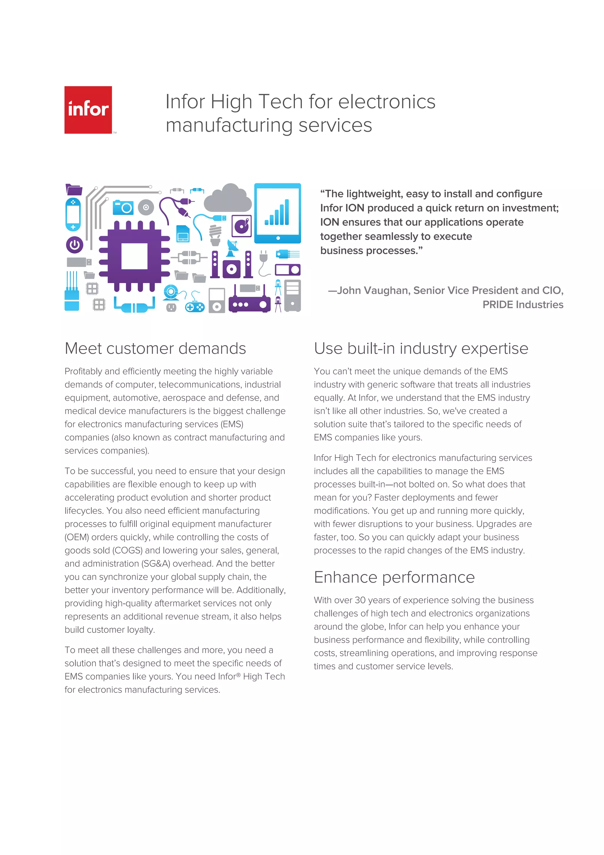 The document summarizes the capabilities of Infor High Tech, a software solution tailored for electronics manufacturing services (EMS) companies. It addresses key challenges for EMS companies, including meeting customer demands profitably and efficiently, ensuring flexible design capabilities, and controlling costs. The software provides functionality for areas like quotation and bid management, customer relationship management, design and engineering, manufacturing, supply chain management, and aftermarket services to help EMS companies improve performance, make better decisions faster, and grow their business.