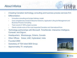 Inforica is a leading Canadian technology consulting and business process services firm with over 75 employees and offices in Mississauga, Ontario, Dubai, and Hyderabad. They offer innovative consulting services focused on enterprise solutions, application lifecycle management, and business process consulting. Their clients include large Canadian and international firms and they have a track record of 100% project success.