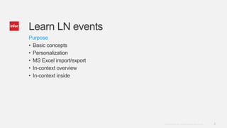 The document provides an overview of user interface concepts for Infor LN, focusing on navigation, role-based homepages, and in-context features. It discusses the layout of the workspace, including application panels, web parts, and process navigation tools designed to enhance user experience. Additionally, it highlights the use of social features for information sharing and personalization within the Infor LN system.