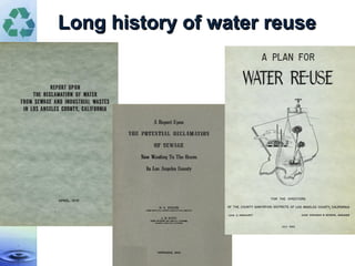 The Sanitation Districts of Los Angeles County have a long history of water reuse and operate 11 wastewater treatment plants that treat over 500 million gallons per day of wastewater. Approximately 200 million gallons per day of treated water is recycled for reuse purposes, with the number of reuse sites increasing. Challenges for recycled water distribution include the high cost of infrastructure and balancing daily and seasonal supply and demand.