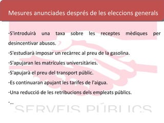 Mesures anunciades desprésde les eleccions generals S'introduirà una taxa sobre les receptes mèdiques per desincentivar abusos. S'estudiarà imposar un recàrrec al preu de la gasolina. S'apujaran les matrícules universitàries. S'apujarà el preu del transport públic. Es continuaran apujant les tarifes de l'aigua. Una reducció de les retribucions dels empleats públics. …