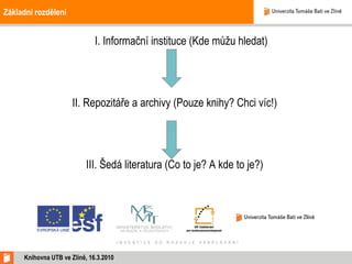 Základní rozdělení I.Informační instituce (Kde můžu hledat) II. Repozitáře a archivy (Pouze knihy? Chci víc!) III. Šedá literatura (Co to je? A kde to je?) Knihovna UTB ve Zlíně, 16 .3.2010