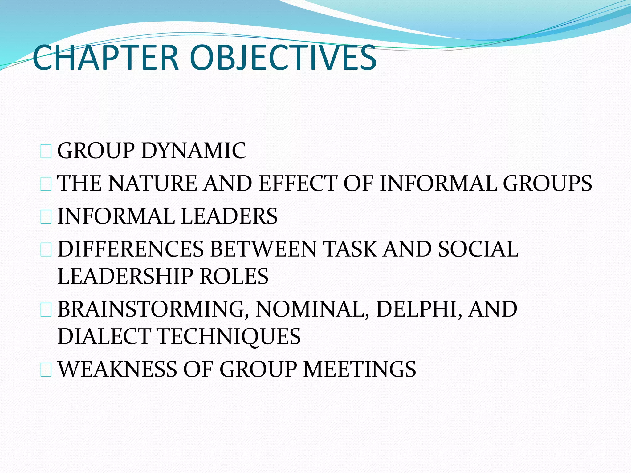 This document discusses group dynamics and informal groups within organizations. It begins by defining key concepts like group dynamic and informal groups. It then discusses the nature and effects of informal groups, including how they emerge spontaneously but can either help or hinder the formal organization. The document outlines the roles of informal leaders and how they differ from formal leaders. It also discusses techniques for managing informal groups, like identifying informal leaders and considering their influence when making decisions.