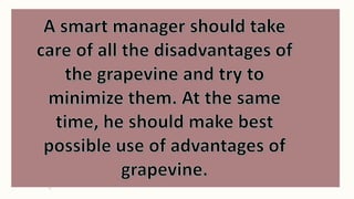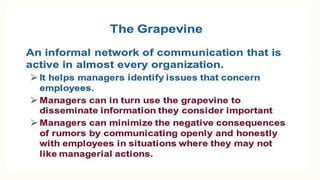 The informal grapevine network model is an informal communication channel that spreads throughout an organization irrespective of authority levels. It exists more at lower levels and is very active in most organizations. There are four types of grapevine: single strand, gossip, probability, and cluster. The grapevine generally develops due to reasons like uncertainty during recessions, preferential treatment of some employees, and a lack of formal channels to exchange views. While it can spread information quickly and provide feedback, the grapevine also carries risks like spreading partial or false information that can reduce productivity and harm an organization's goodwill.