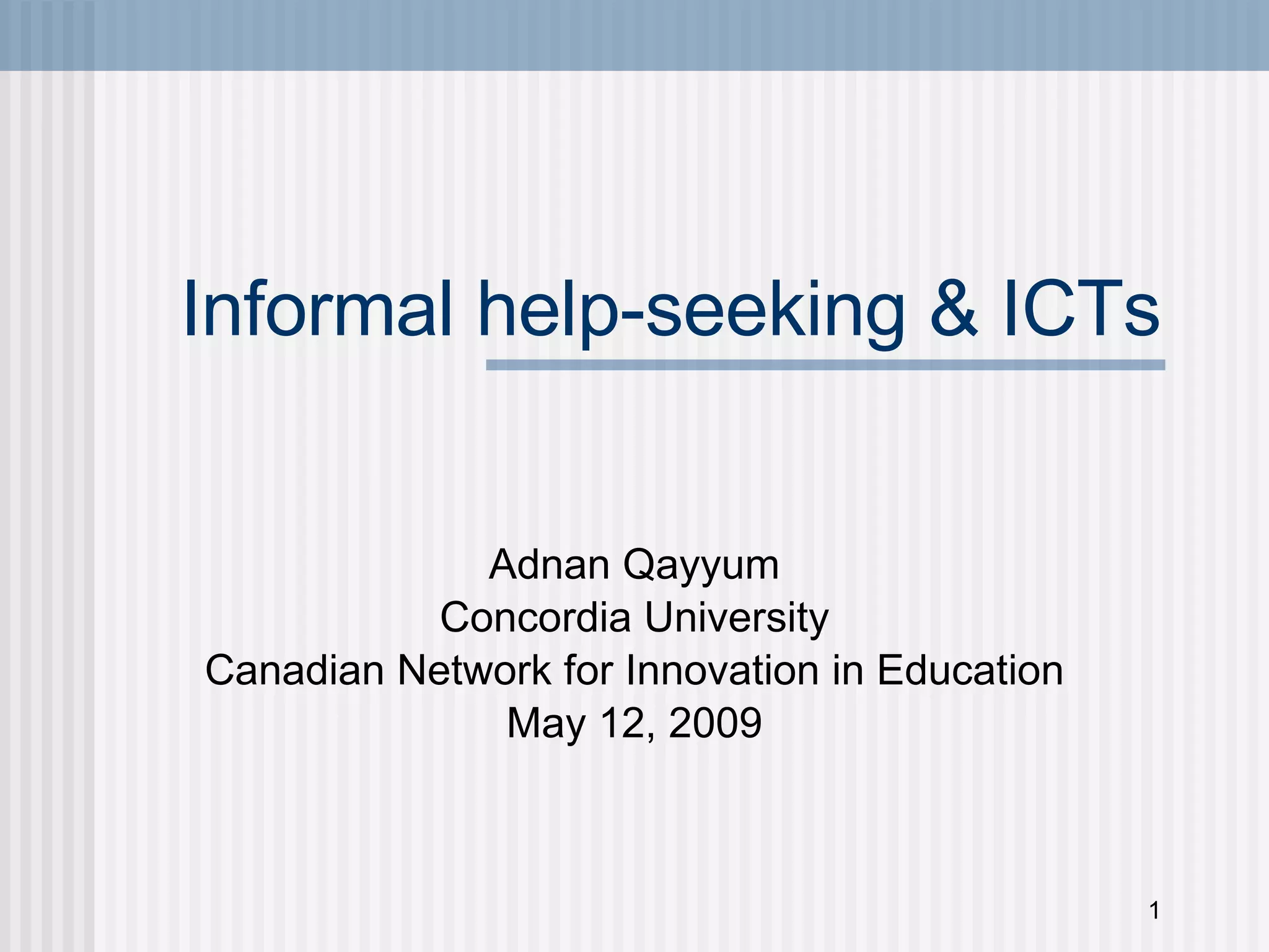The document summarizes research on how students seek informal help and communicate outside of class for course-related purposes using information and communication technologies (ICTs). A qualitative study found that students communicate through various channels like in-person, phone, writing tools for different topics like coursework, administrative issues, and social purposes across both social and work spaces on and off campus. A quantitative study found that students are motivated to communicate with peers due to their perceived usefulness and trustworthiness. Students prefer synchronous communication channels like in-person, phone and instant messaging when communicating with peers. The findings could inform how to reduce student threat to seek help and promote synchronous ICT options to support learning.
