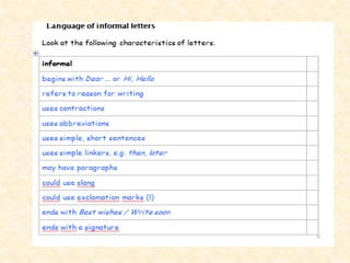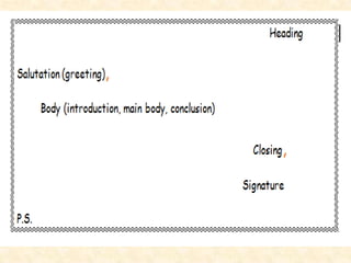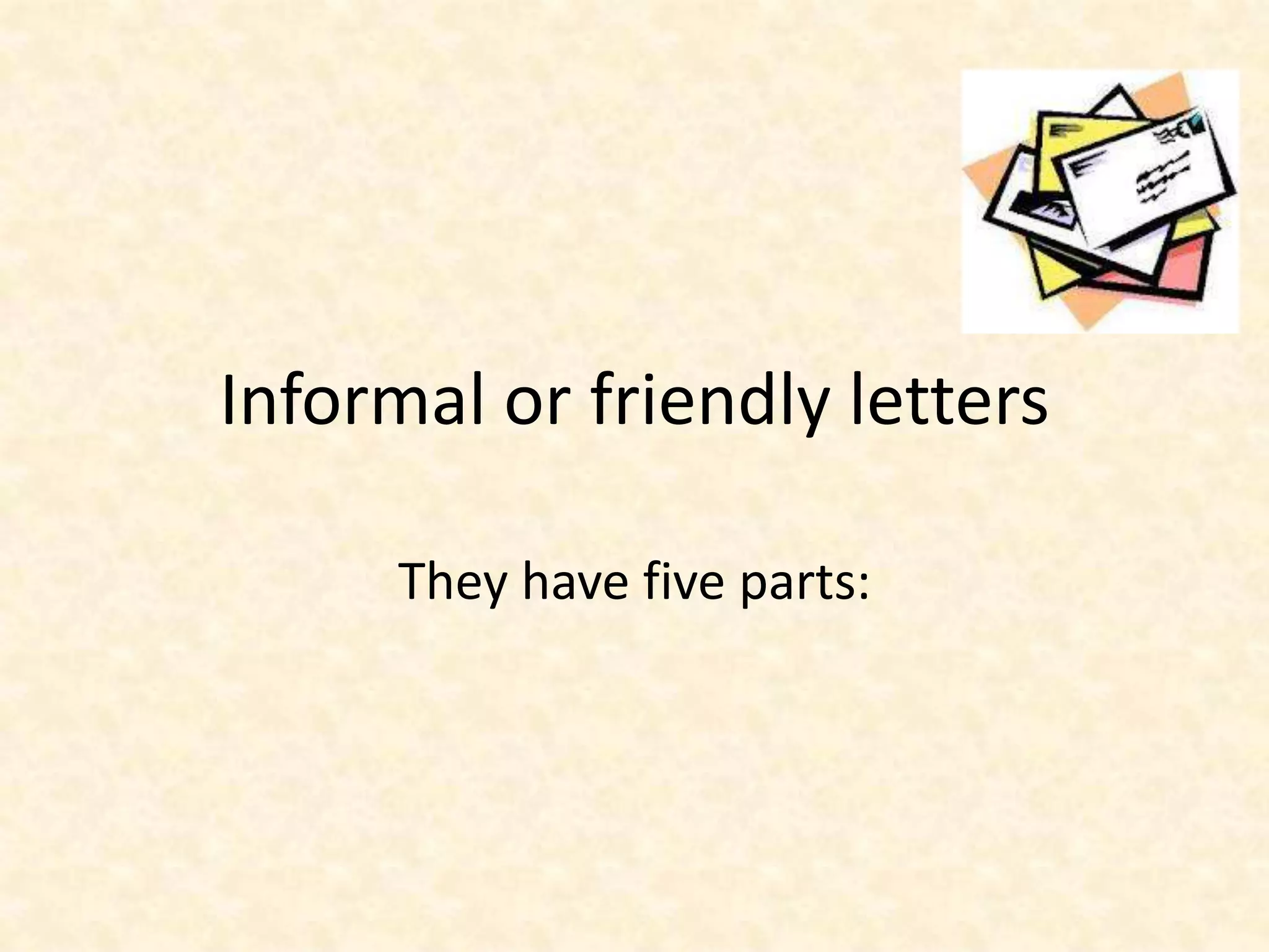 Informal or friendly letters typically contain 5 parts: 1. The Heading includes the date but not necessarily the sender's address. 2. The Salutation is a greeting that ends in a comma, such as "Dear Uncle" or "Hi Joe". 3. The Body contains the message, which is usually introduced and concluded. Paragraphs are indented and the main body develops the subject. 4. The Closing is a short expression on a single line with the first word capitalized and a comma after the last word. 5. The Signature line contains the sender's name under the closing.