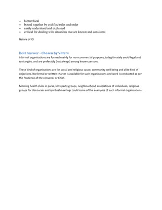 The informal organization consists of the social structures and relationships that govern how people work together and get work done outside of official job roles and hierarchies. It evolves organically based on changes in the work environment and the dynamics between members. When supported, the informal organization can enhance collaboration, innovation, and problem solving. It is distinct from the formal organization in that it is evolving, grassroots-driven, responsive to change, and based on trust and reciprocity rather than codified rules.