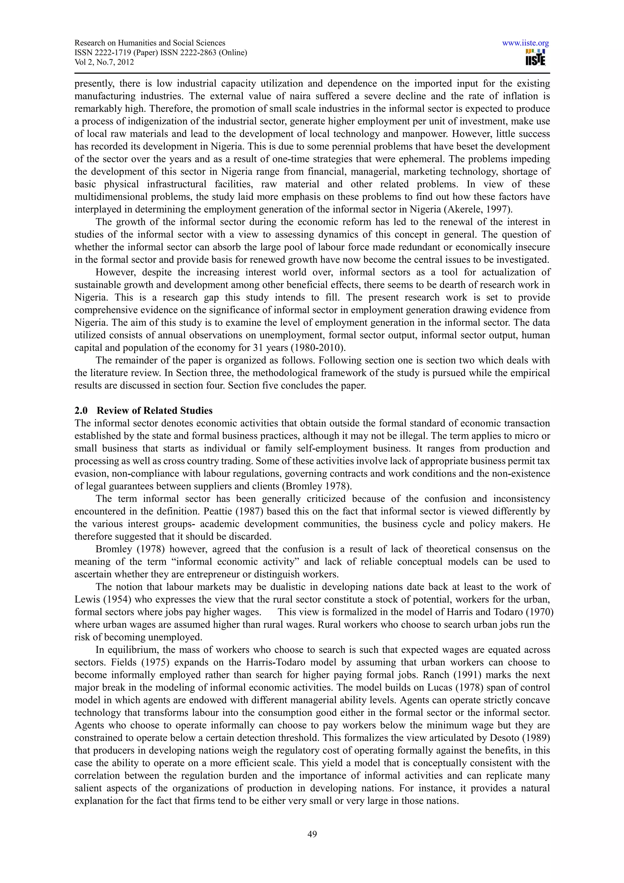 This document summarizes a research paper that examines the impact of the informal sector on employment generation in Nigeria from 1970 to 2010. The paper finds that informal sector activities significantly contribute to absorbing the large pool of unemployed labor in Nigeria. However, human capital formation is positively related to unemployment, reflecting lack of government spending on education. The informal sector plays an important role in the Nigerian economy through employment generation, capital mobilization, and entrepreneurship training, but it faces challenges such as lack of infrastructure, financing, and raw materials that have hindered its development and potential impact.