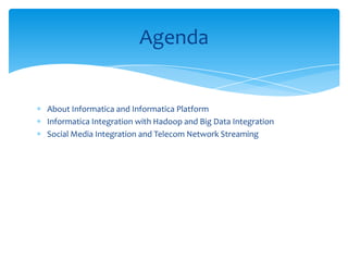 This document provides an overview and agenda for a presentation on Informatica Big Data and Social Media Integration. It discusses Informatica and its platform, integration with Hadoop and big data, social media integration, and Informatica's telecom network streaming integration solution. The document includes information on Informatica's history and partnerships, how its platform addresses traditional ETL challenges, its features for working with Hadoop and big data, and how it can be used to integrate social media data and perform customer sentiment analysis.