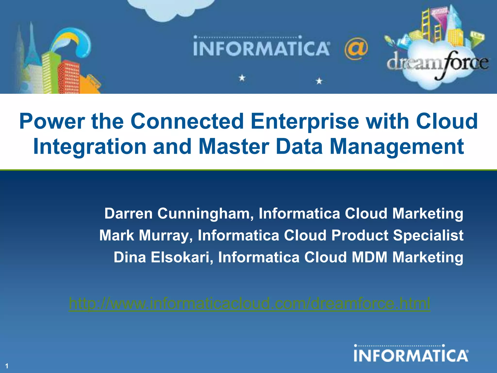 The document outlines key highlights from the #df12 event, focusing on cloud integration and master data management (MDM). It features use case demonstrations of integrating Salesforce with SAP and showcases Informatica's cloud MDM solutions. The agenda emphasizes leveraging cloud technologies to enhance enterprise data management and connectivity.
