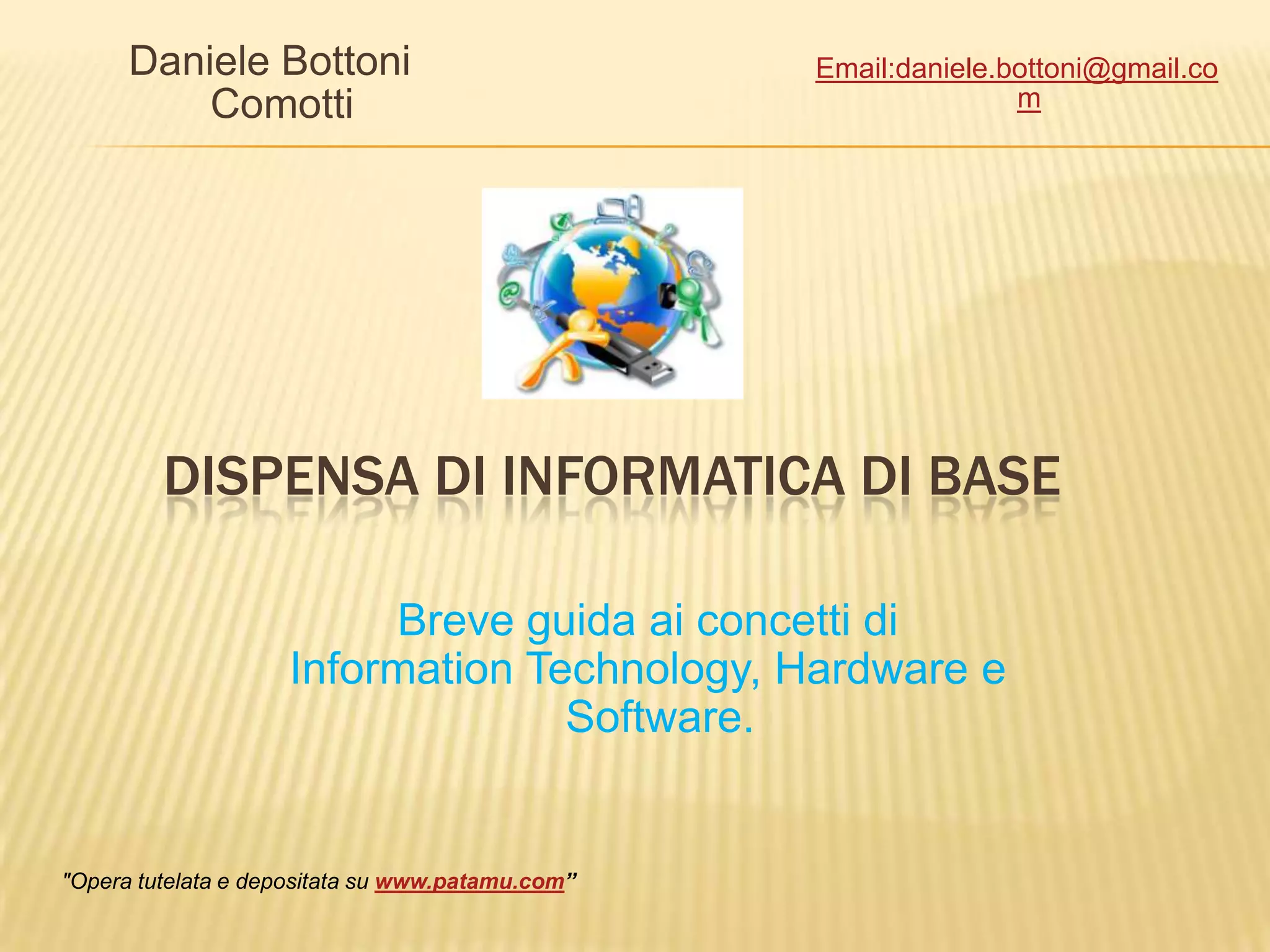 La dispensa di Daniele Bottoni Comotti offre una panoramica sui concetti fondamentali dell'informatica, inclusi hardware e software, e l'importanza delle tecnologie dell'informazione nella società moderna. Viene definito il computer come un elaboratore elettronico digitale, con una storia dal suo antenato, l'abaco, fino ai moderni sistemi informatici. La guida approfondisce anche componenti come RAM, hard disk e software, evidenziando il ruolo cruciale del computer nel mondo lavorativo odierno.