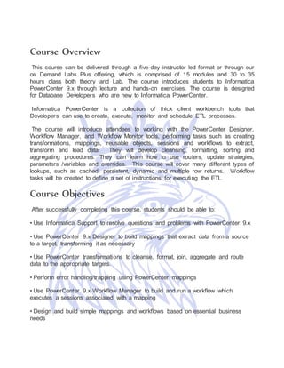 This course offers a comprehensive introduction to Informatica PowerCenter 9.x, designed for database developers new to the tool, delivered via a five-day instructor-led format or as on-demand labs. Participants will learn to create, execute, and monitor ETL processes, covering essential functionalities such as data cleansing, transformations, and workflow management through practical exercises. The course includes workshops for real-world application of concepts and best practices in mapping and workflow design.