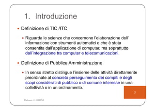 Il documento analizza l'intersezione tra informatica e pubblica amministrazione, evidenziando l'evoluzione da un modello burocratico a uno più interattivo e decentralizzato. Si sottolinea l'importanza dell'informatizzazione per migliorare l'organizzazione interna e le relazioni con i cittadini, attraverso l'implementazione di servizi telematici. Infine, vengono presentate le applicazioni pratiche dei processi di informatizzazione nella pubblica amministrazione e le potenzialità offerte dalle tecnologie per migliorare comunicazione e servizi.
