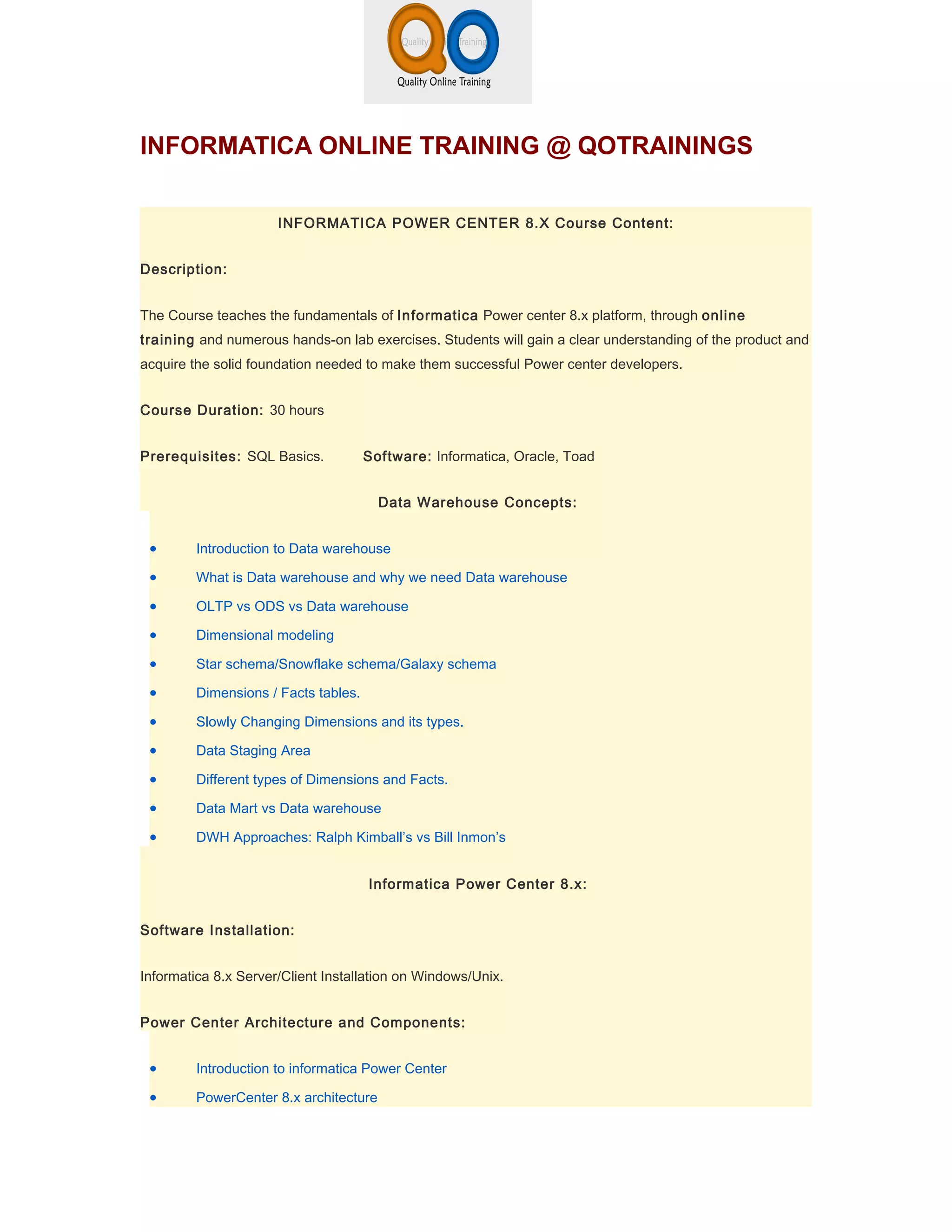 This document provides an overview of the content covered in an Informatica PowerCenter 8.x online training course. The 30-hour course teaches students the fundamentals of Informatica PowerCenter through online lectures and hands-on lab exercises. Students will learn about data warehousing concepts, installing and using PowerCenter, designing mappings and workflows, and transforming and loading data. The course covers all the major PowerCenter components, transformations, and features through a combination of lessons and 30 labs.