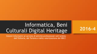 Il documento esplora l'evoluzione dell'informatica applicata ai beni culturali, evidenziando il lavoro pionieristico di padre Roberto Busa nell'analisi dei testi di Tommaso d'Aquino attraverso l'usage di tecnologie informatiche sin dagli anni '60. Busa ha realizzato l'«Index Thomisticus», una grande opera editoriale che ha rivoluzionato l'editoria e ha posto le basi per lo sviluppo della linguistica computazionale. Oggi, l'editoria ha fatto un salto significativo verso il digitale, trasformandosi completamente con l'emergere di formati ebook e tecnologie come il desktop publishing.